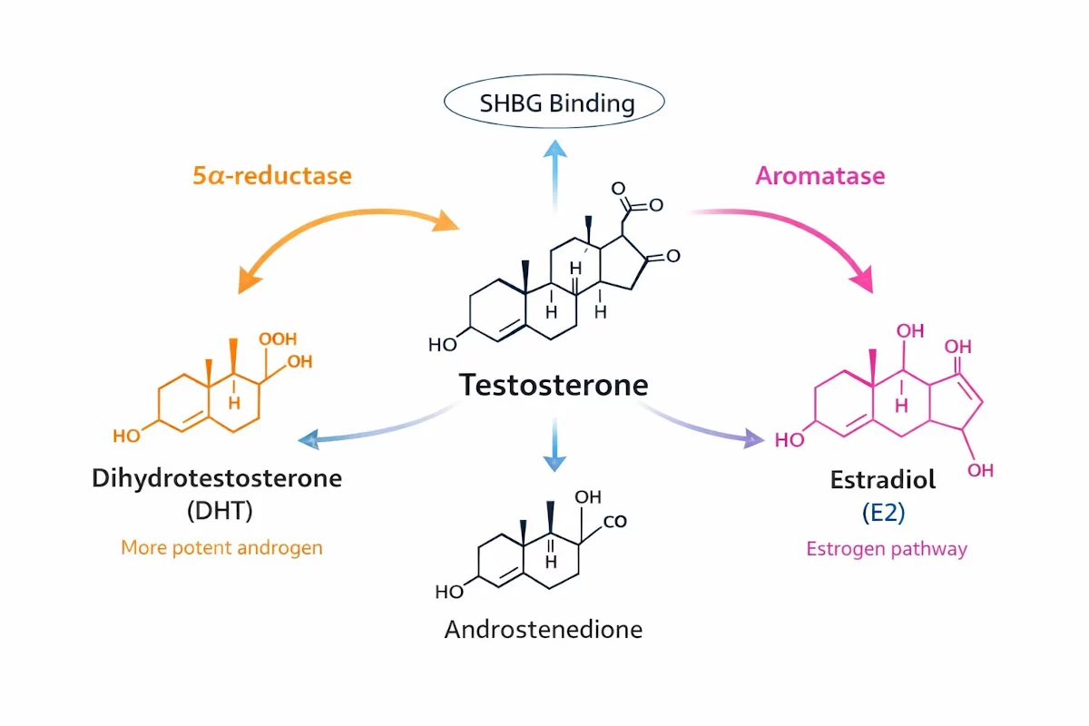 Once testosterone enters circulation, it doesn’t act alone. Instead, it is metabolized through multiple pathways.